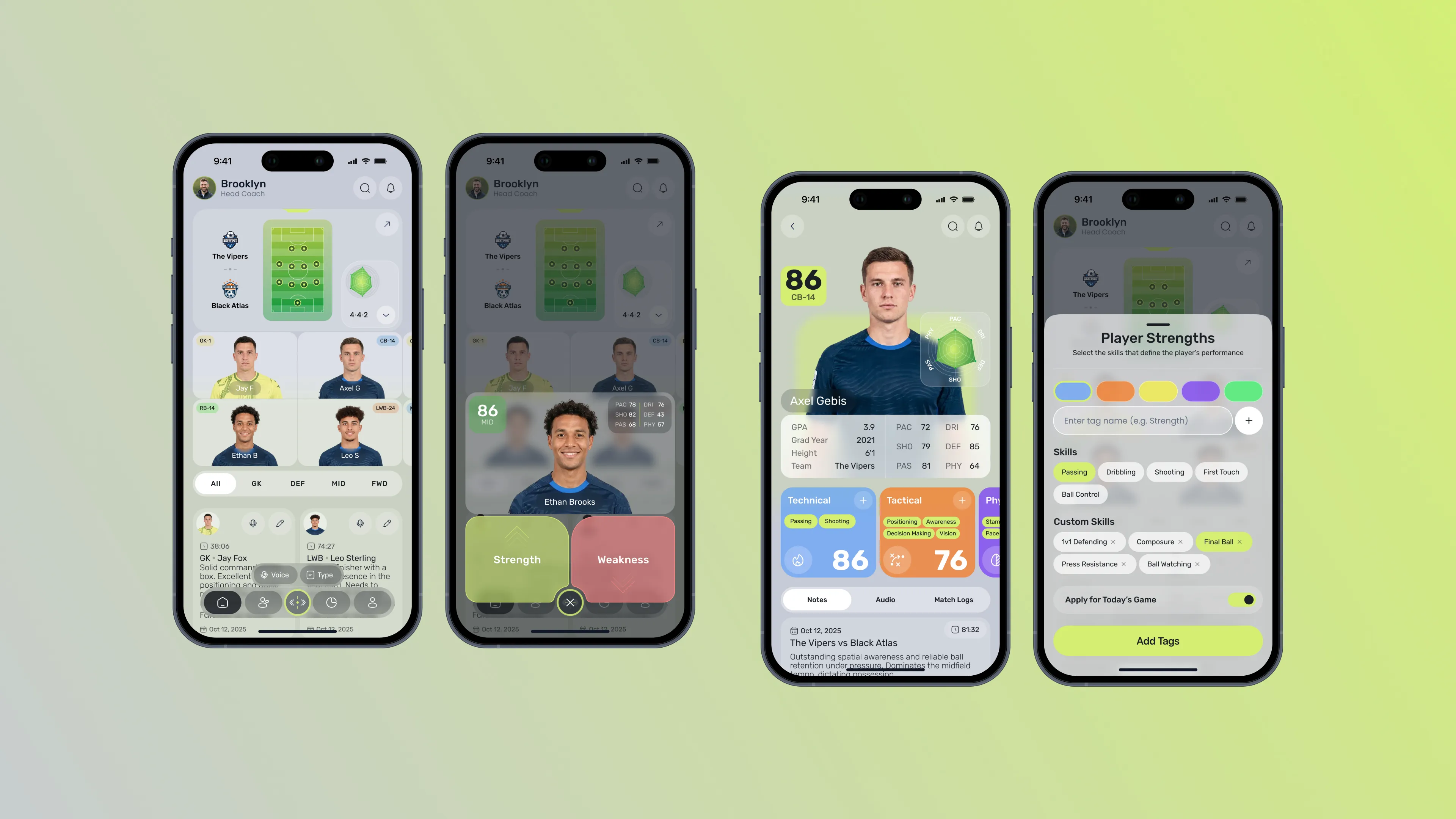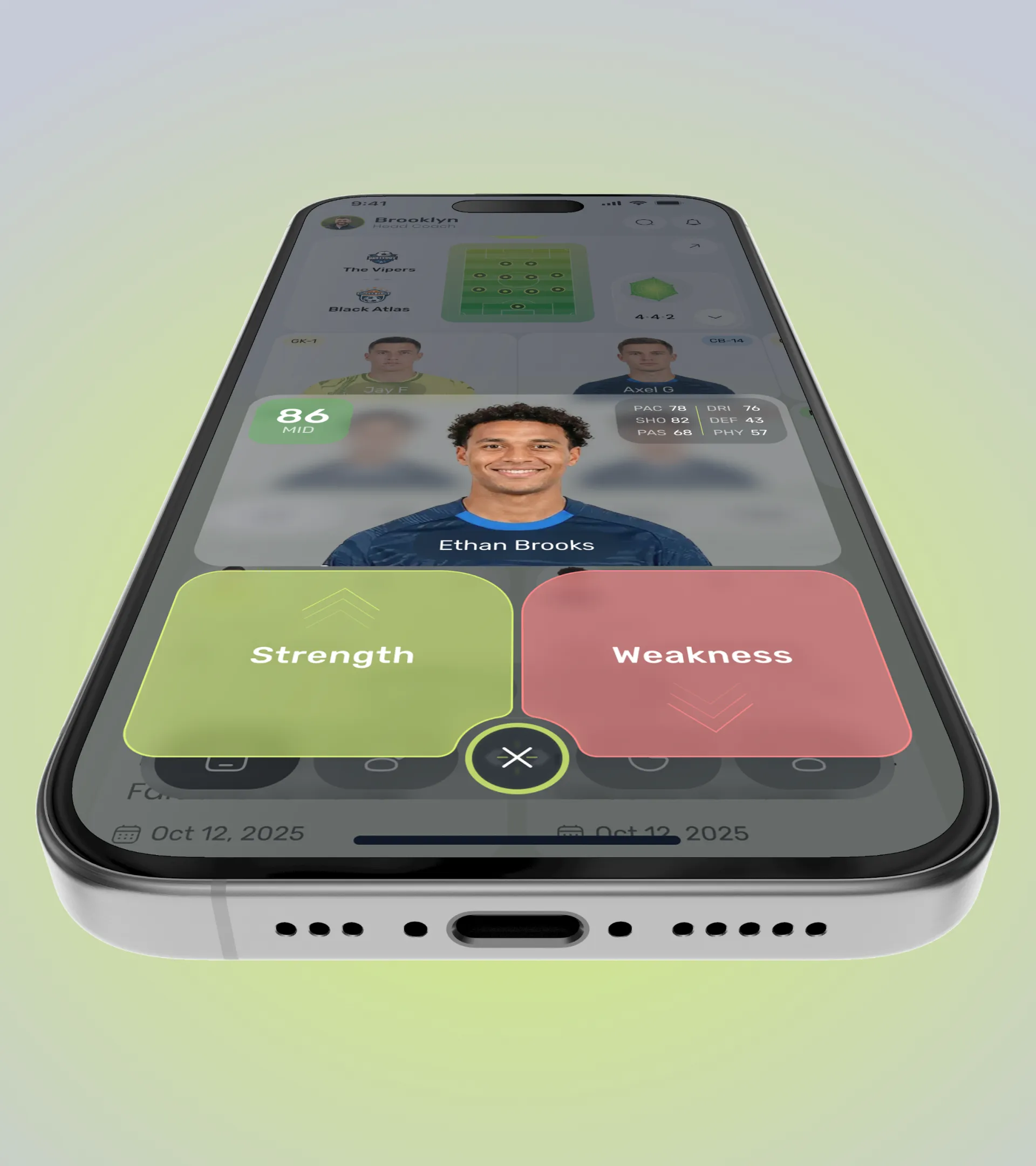 Working from strict technical specifications, my goal was to create an interface that is fast enough for live matches. A coach cannot afford to look down at a screen for too long. I designed a system of "quick actions" where evaluating a player marking a Strength or Weakness takes milliseconds